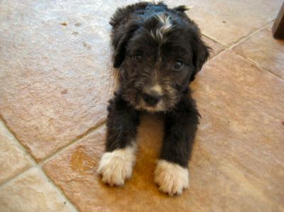 About 15 minutes from home, we saw what we thought was a tiny lamb in the distance on the track. When we got closer we realised it was a tiny puppy and Rocky immediately tried to play with him.Hhe followed us on wobbly legs for a few hundred metres then collapsed onto the floor so we picked him up and took him home.