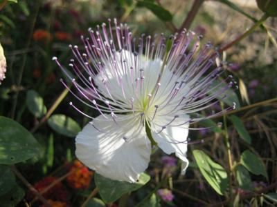 The flowers of the caper bush are only in full bloom in partial shade so the best time to see them is at sunrise or when the heat of the sun is waning as they seem to hate the intensity of full sun.