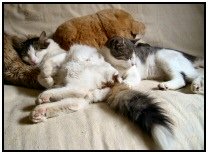 | Basil and Bengie arrive - such cute kittens but Jasmine hates them! | Basil is taking over but isn't exactly very energetic. | Within 3 weeks, Jasmine and the boys are best buddies. Such cute cats. Don't you just love them! |