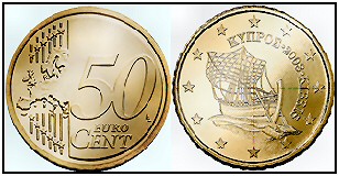 The 10, 20 and 50 cent coins show the ancient ship of Kyrenia