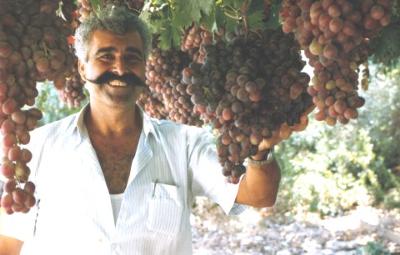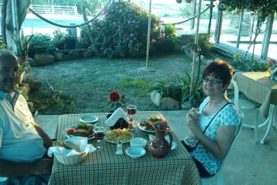 Owner, Matheos Kannavias. The garden side of the restaurant is unique with organically growing grape vines, figs trees, roses and many vegetables, where someone can relax, while having a drink, lunch or dining.