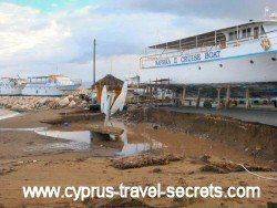 This picture shows how close some of the large boats got to being badly damaged. A large chunk of the concrete hard standing on the harbour close to Y and P's taverna completely disappeared, almost taking the Nafsika cruise boat with it.